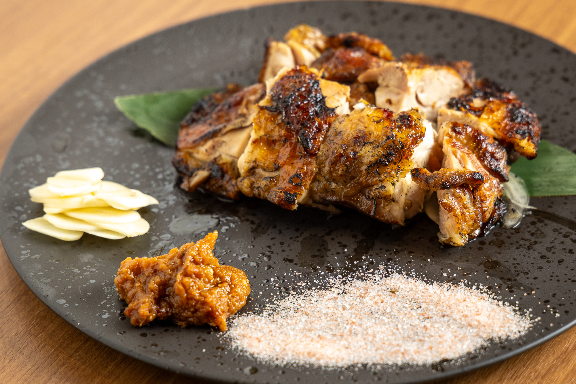 つくば鶏のもも一枚肉のわらやきは、パリッと焼き目が付いた皮目とジューシーな肉質が美味。お好みで岩塩と特製味噌、ニンニクと一緒にどうぞ。