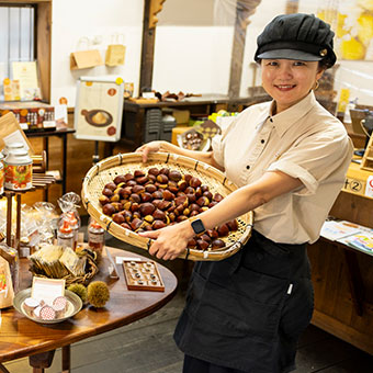 「どんなに手間をかけてでも、本当に美味しい栗を作りたい」。そんな思いから、「貯蔵栗」を開発。この栗の特長は、0℃で貯蔵していること。栗に"冬"を感じさせることで、栗内部のデンプン質が糖分に変化し、甘みがぐっと増します。さらに笠間市では栗の品種別に重量選別方式を採用した選果を行うことで品質の均一化を図り、その美味しさと品質を高めています。また、冷蔵熟成を行うことで日本栗の粉っぽさが少なくなり、加熱時に焼き芋のようなねっとりした食感を生み出すといいます。