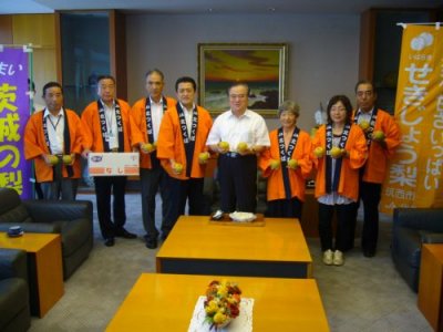EVENT / 旬のうまいもの特集 新着・イベント情報 筑西市・JA北つくばが「梨・幸水」を県庁でPR(2010/08/19) 8月18日(水曜日),筑西市の吉澤市長,JA北つくばの生産者の代表など17名が県庁を訪れ,橋本知事へ出荷最盛期を迎えている梨「幸水」をPRしました。 筑西市の梨は栽培面積が351haと県全体の(1,520ha)の23%を占め(H18),県内第1位の産地であるとともに,国内でも有数の産地です。 今年は3・4月が低温でしたが,その後の天候回復により,味が良く,肉質もしっかりした梨に仕上がっています。 今,旬を迎えている甘くて美味しい筑西市の「幸水」をぜひご賞味ください。 【お問い合せ先】 筑西市経済部農政課 電話:0296-20-1161 今、おすすめの記事 {{row.type_jp}} {{row.title}}