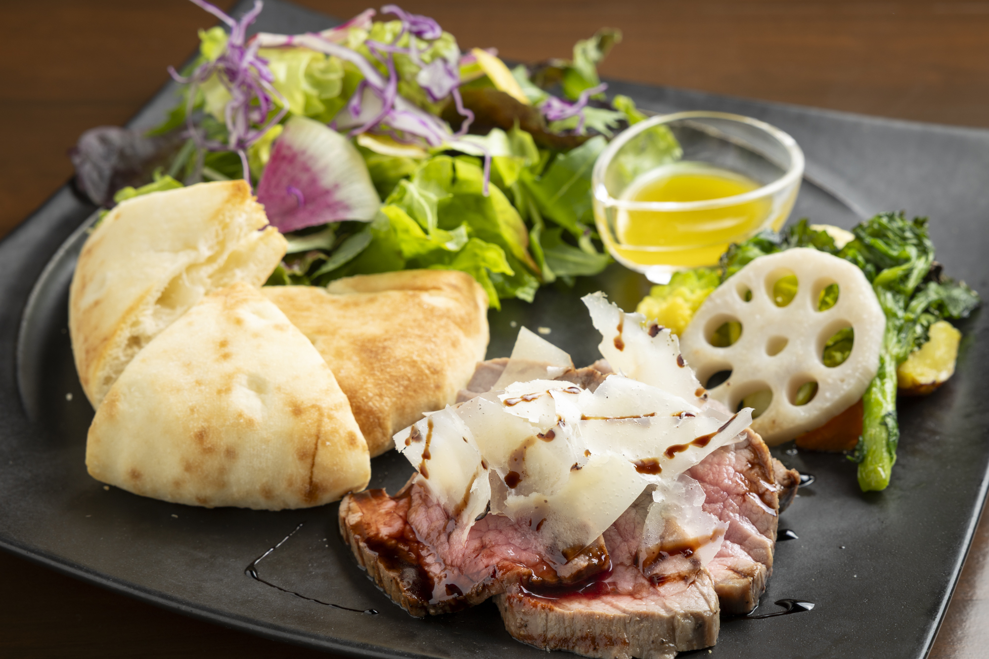 地元常陸牛の肥育業者を指定して仕入れる常陸牛。そのモモ肉を絶妙の火入れで仕上げ、噛み応えのある厚切りで提供。一緒に添えられた野菜にもこだわり満載!自家製フォカッチャと組み合わせれば最高の組み合わせのひと皿に‼