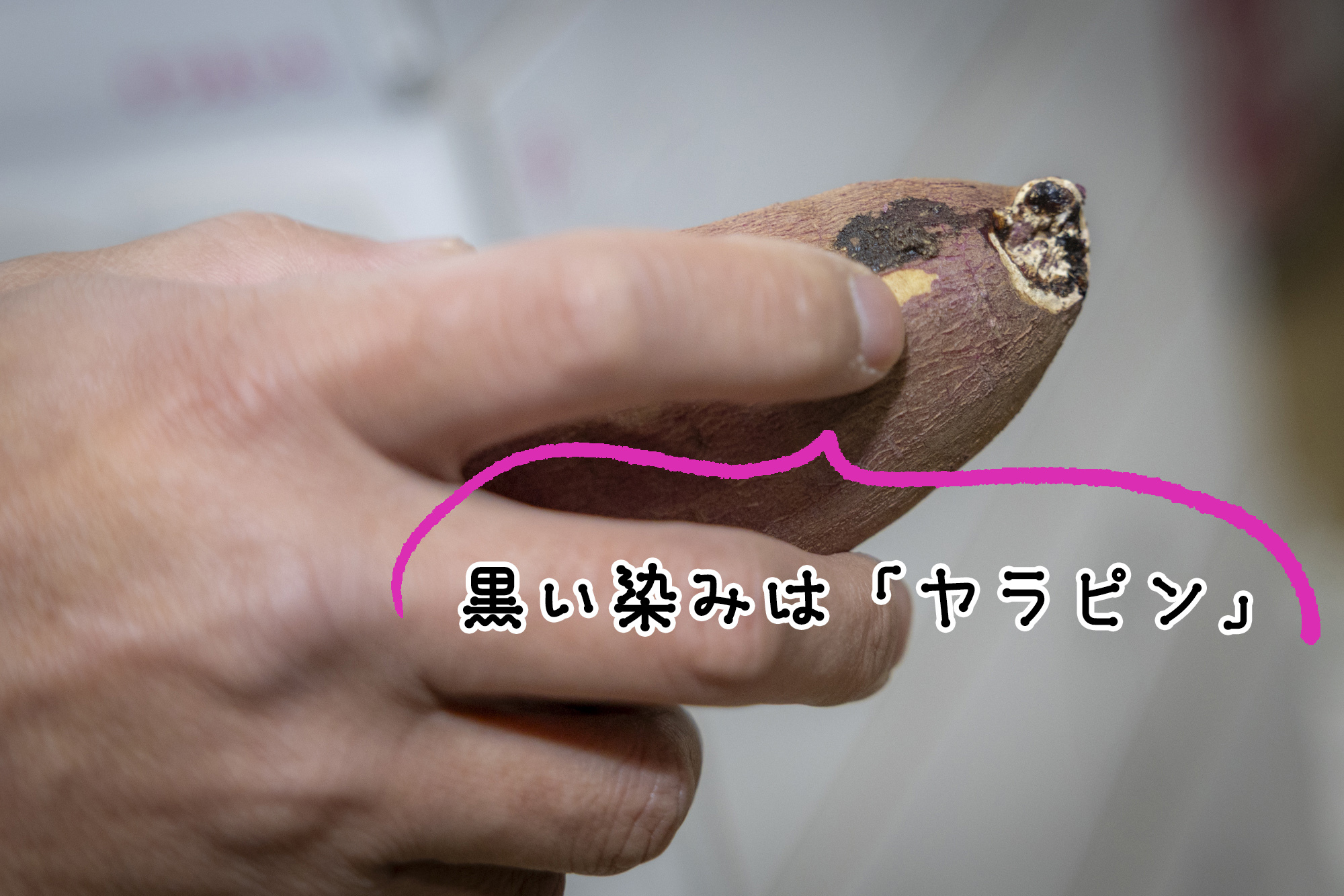「ここ(根の部分)に黒く出ているものはヤラピンといいます。ヤラピンが出ている芋の方が、しっかり熟成されていて甘くなっていると思います。行方では主に焼き芋用をメインに出荷しているので、これも良いさつまいもの大事な条件ですね」(箕輪さん)